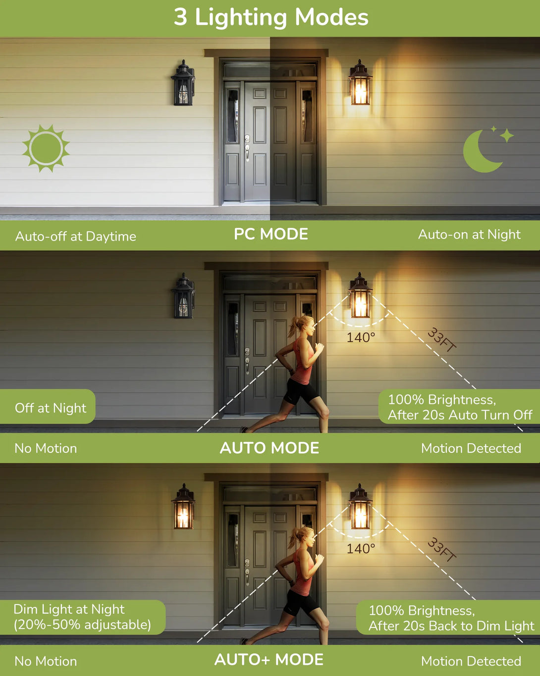 【Upgraded 3 Modes】Our exterior wall lamp provides 3 modes: ①PC mode: automatically turns on at dusk and turns off at dawn; ②Auto mode: keep off at night, and lights up at 100% when motion is detected; ③Auto+ mode: keeps 20% brightness at night (20%-50% adjustable), changes to 100% when motion is detected, and resumes to 20% after 20s (20s-180s adjustable) of no motion behavior