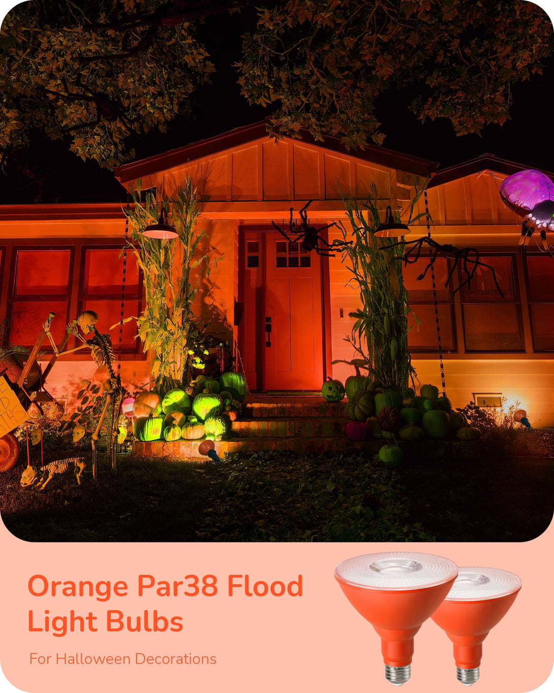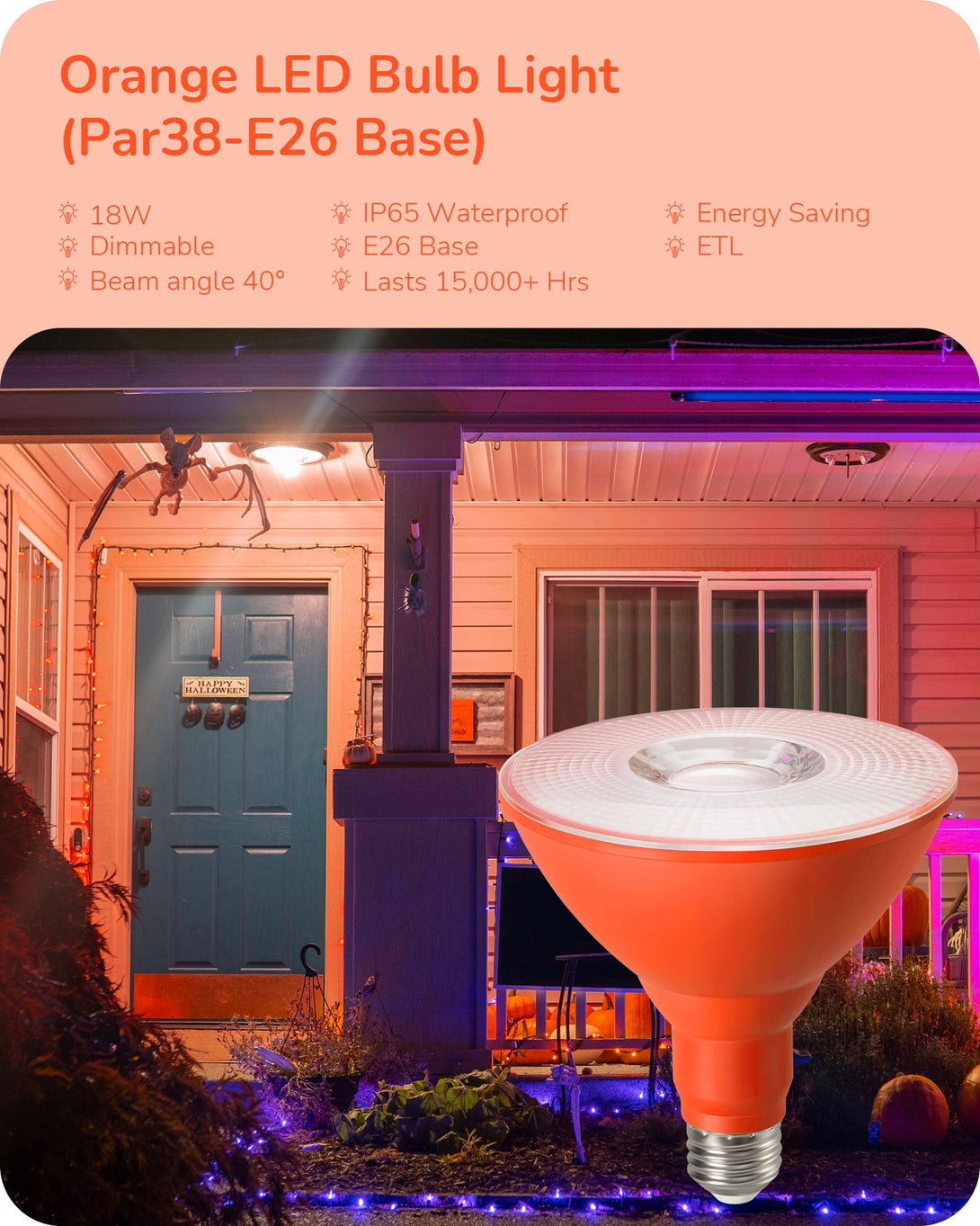 EDISHINE 4 Pack Halloween PAR38 Orange LED Flood Light Bulbs Outdoor, Dimmable, Orange LED Light Bulb, 18W(120W Equivalent), Flood Lights Bulb for Halloween Decorations, E26 Base, ETL Listed