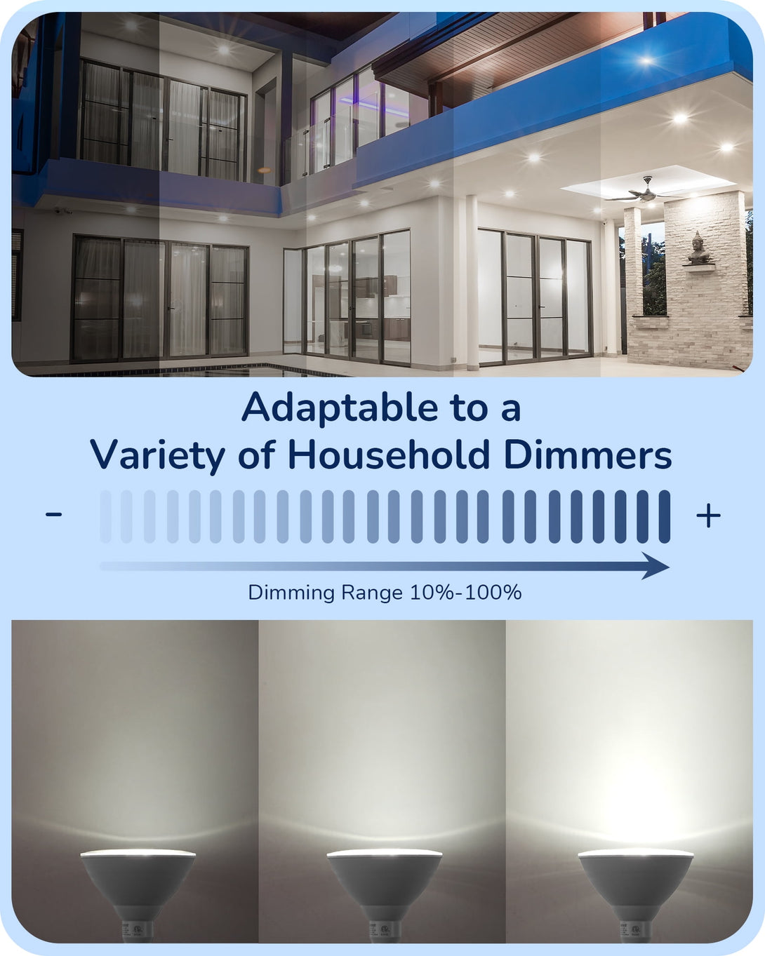 [Smooth Dimmable] Our PAR38 outdoor LED flood lights provide a seamless dimming from 10% to 100%, you can adjust the brightness according to your preferences, creating different atmospheres as desired; compatible with various dimmers, flicker-free and eye-protective