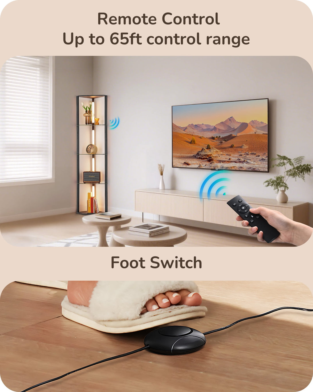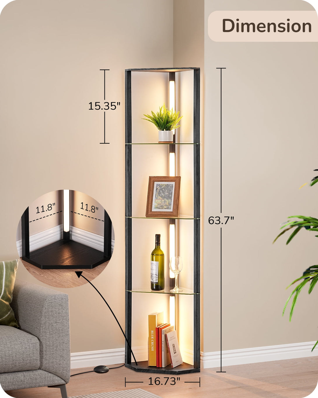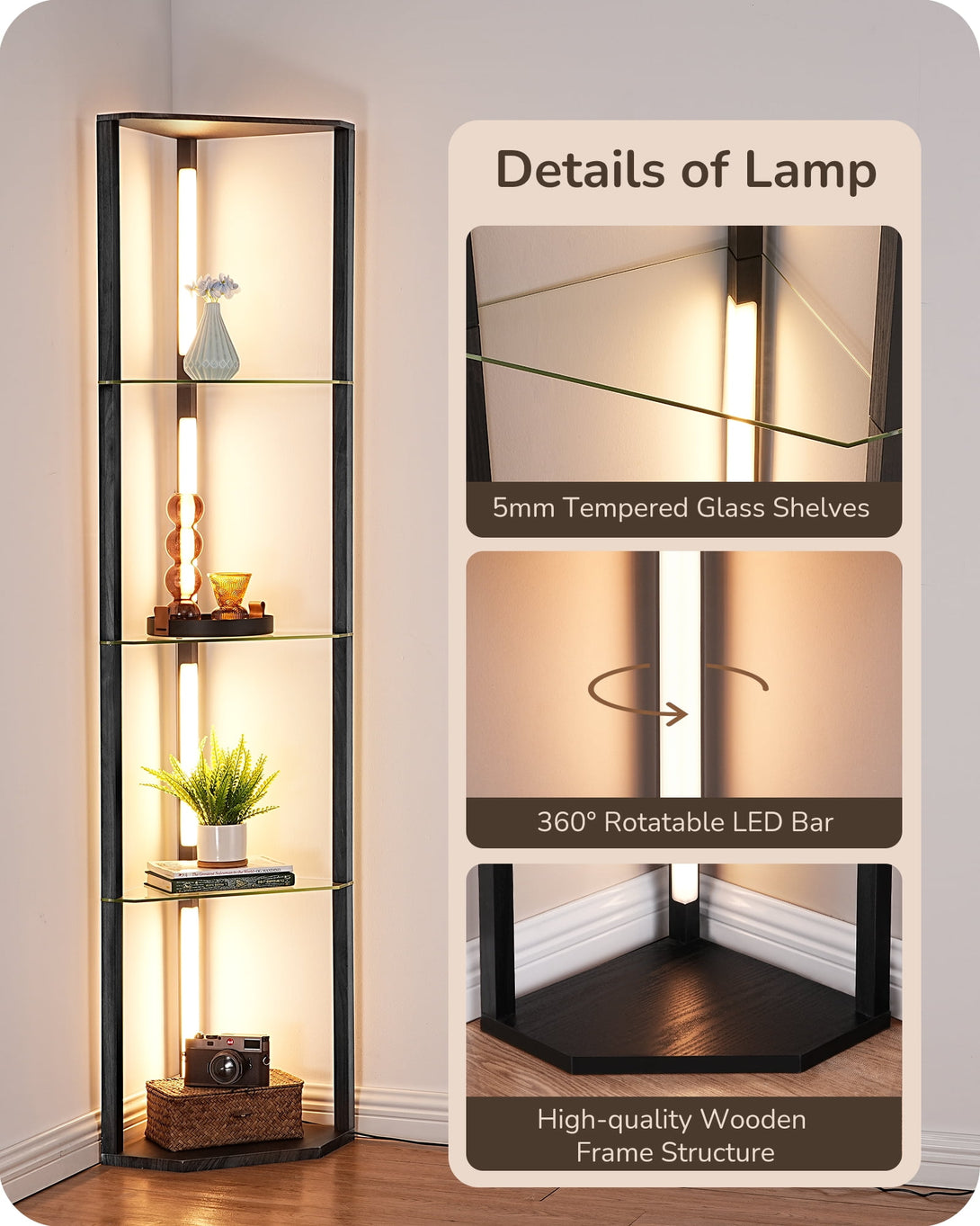 EDISHINE 63.7-Inch 4-Tier Modern LED Corner Floor Lamps with Glass Shelves, Dimmable Standing Lamp with Remote, Display Shelf Floor Lamp for Living Room, Bedroom