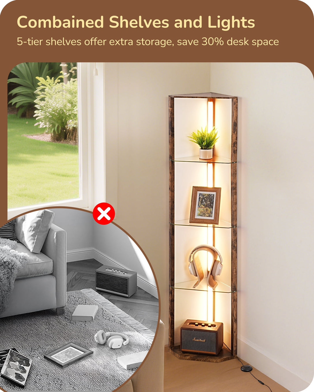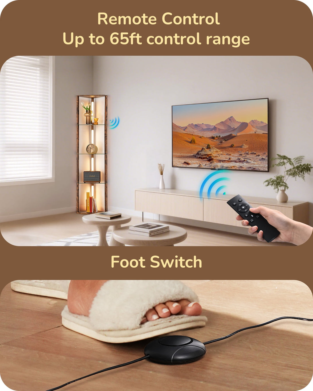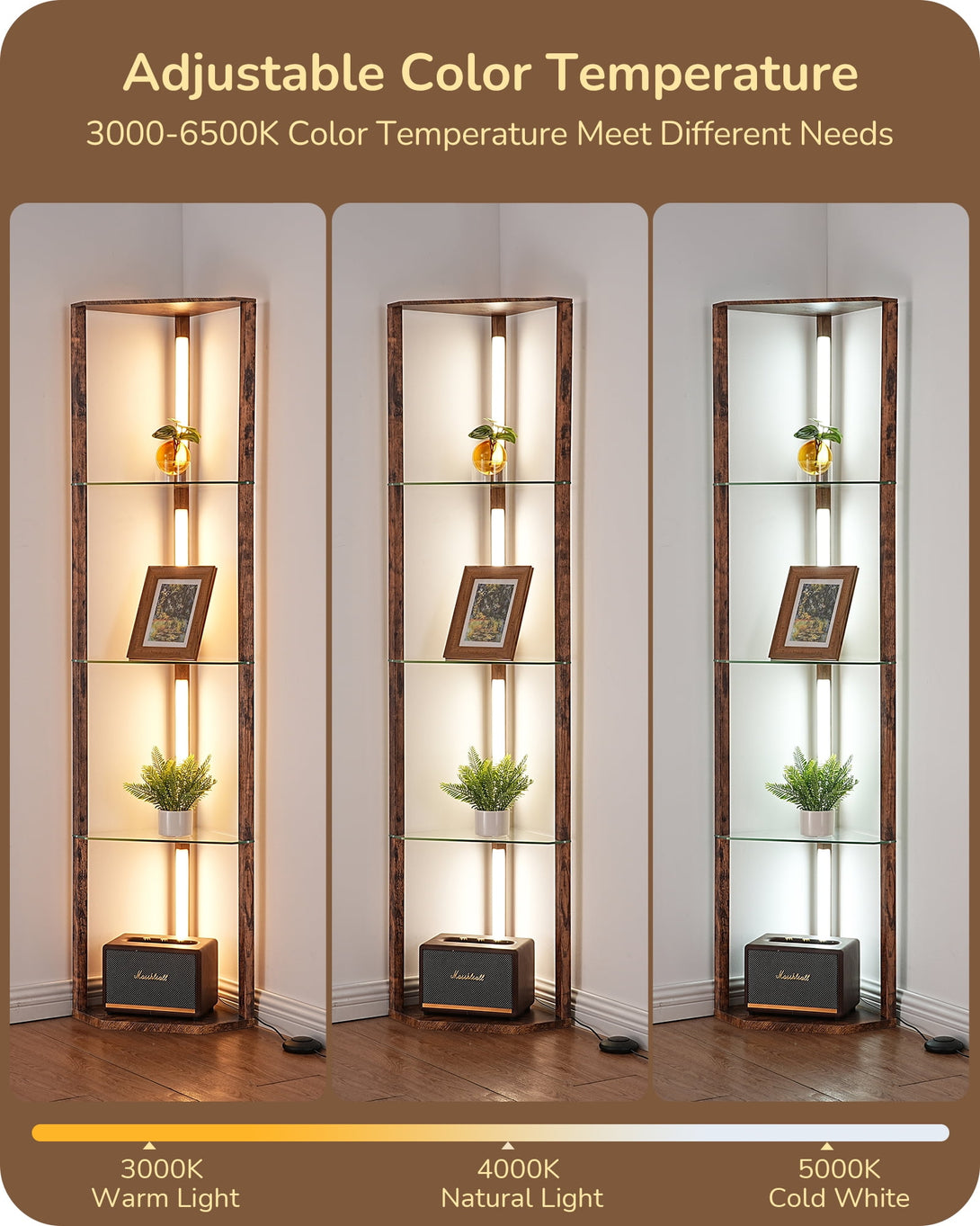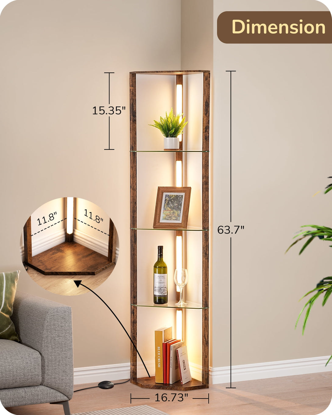 EDISHINE 63.7 Inch Corner Shelf with Light , 4-tier modern glass shelf with Remote/Foot Control, 3CCT & Dimmable Corner Lamp, Display Shelf Floor Lamp for Living Room, Bedroom,Open Display Cabinet