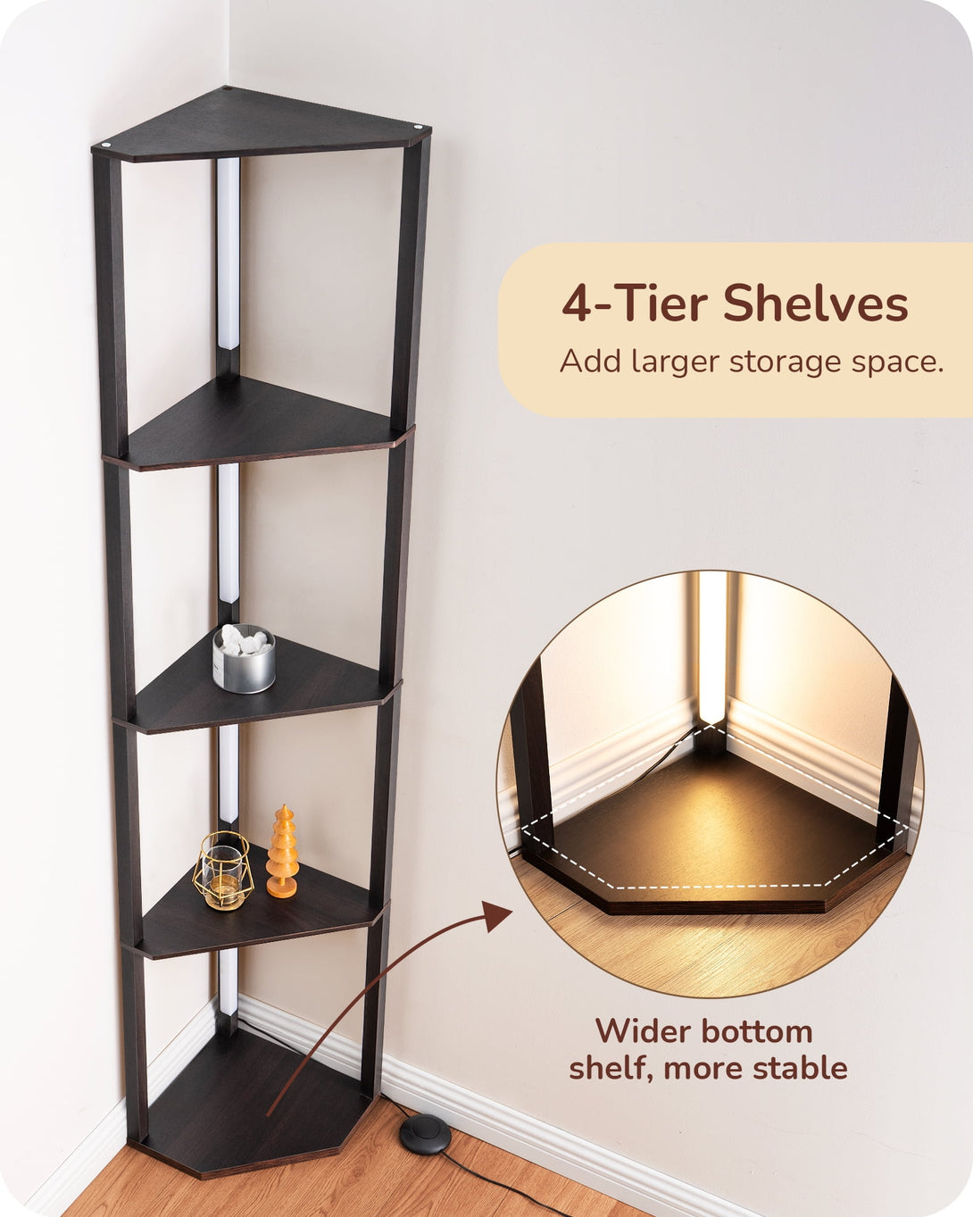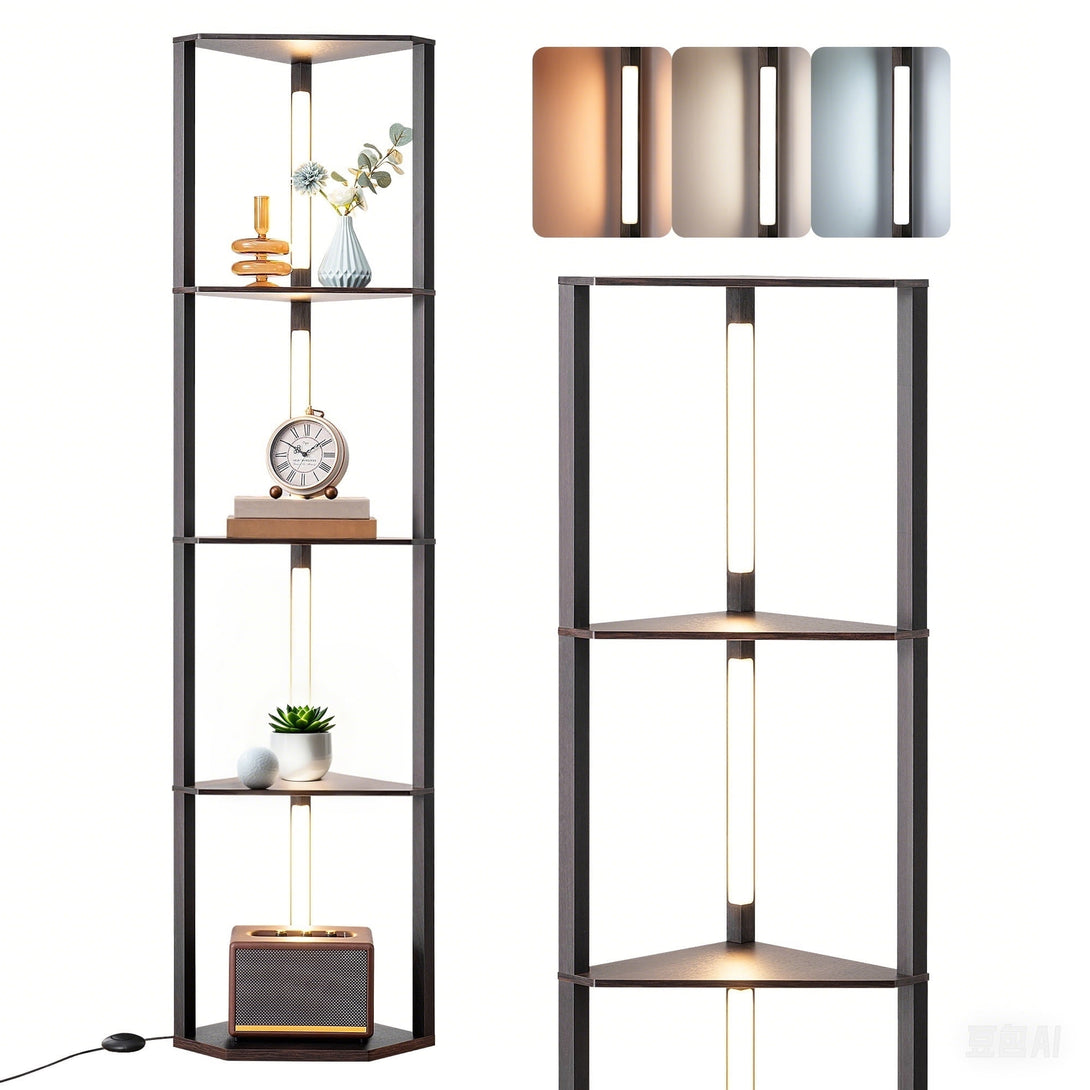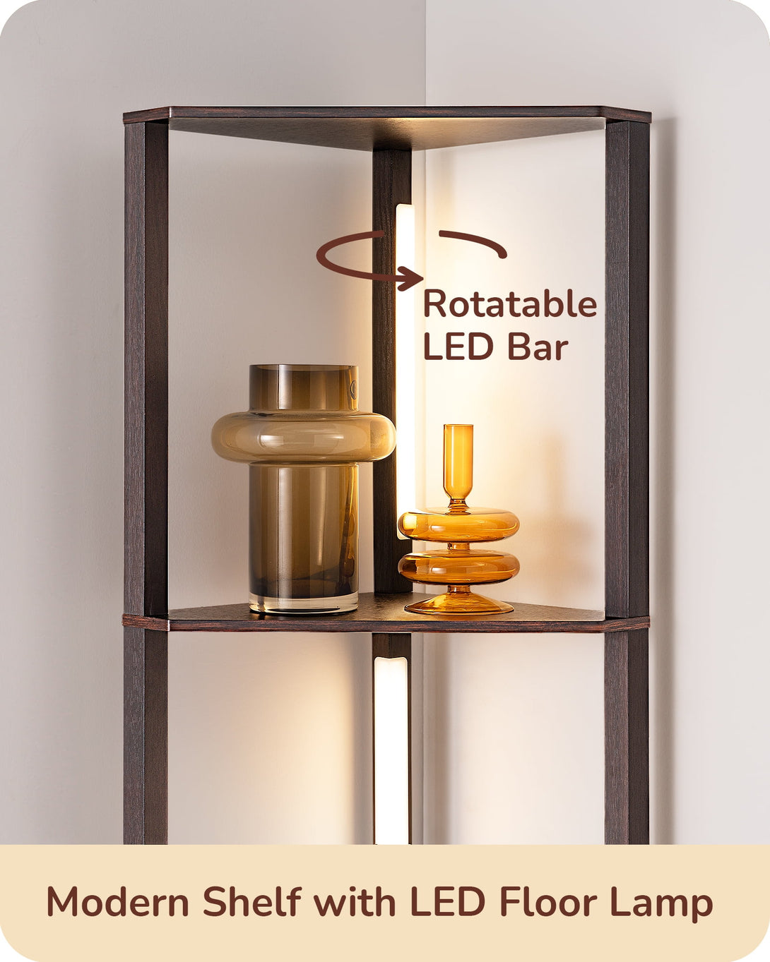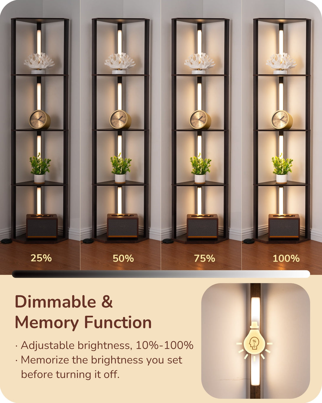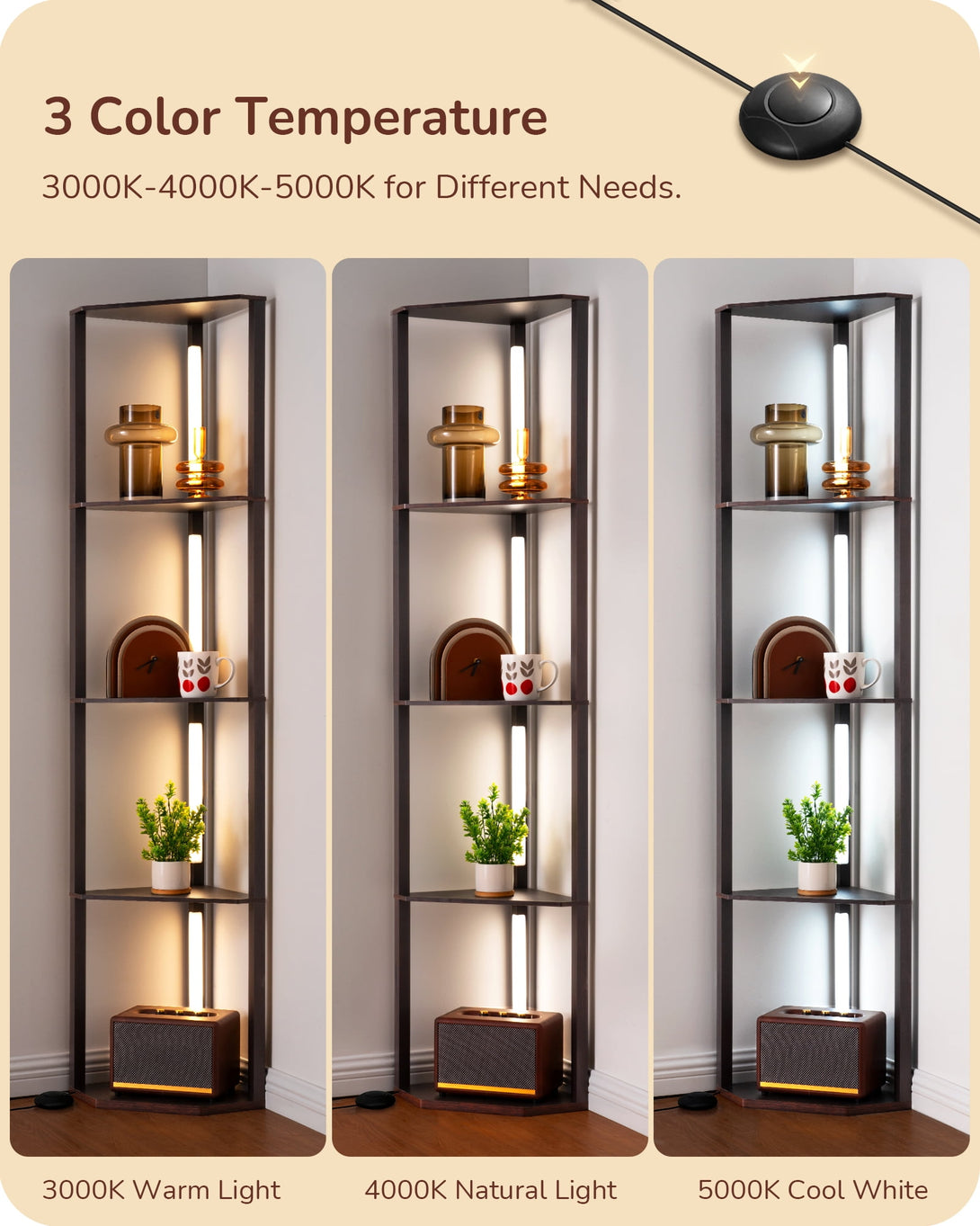 EDISHINE 64in Shelf Floor Lamps for Bedroom Office Living Room, Modern LED Corner Light with Shelves, 3CCT, Stepless Dimmable, Tall Floor Light for Bedroom, Office, Dining Room, Black Walnut