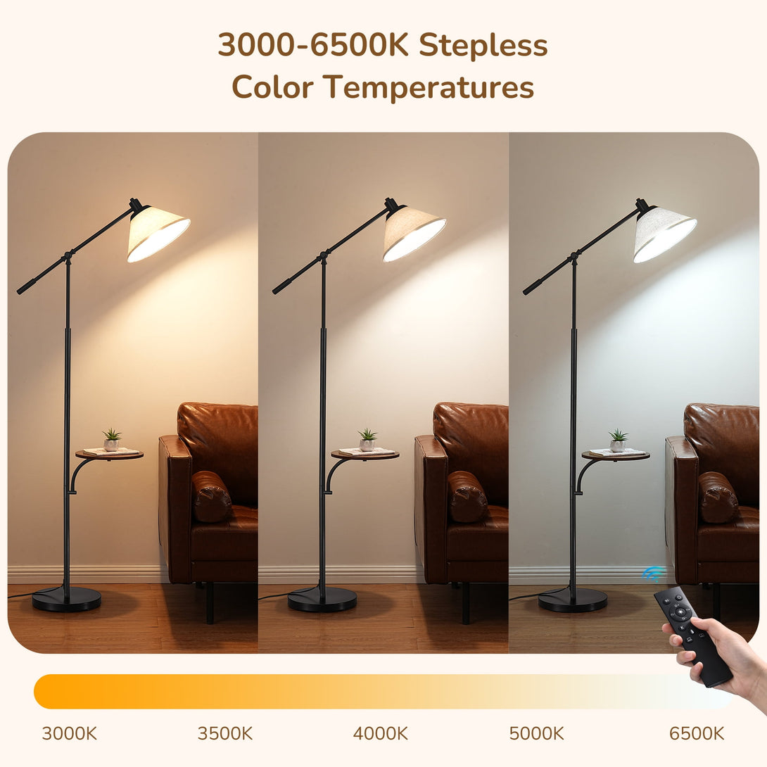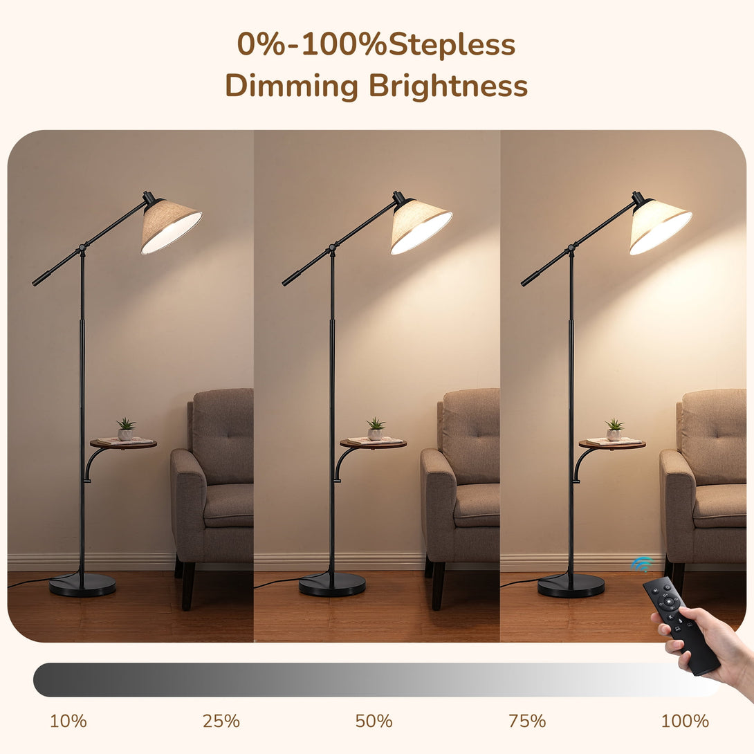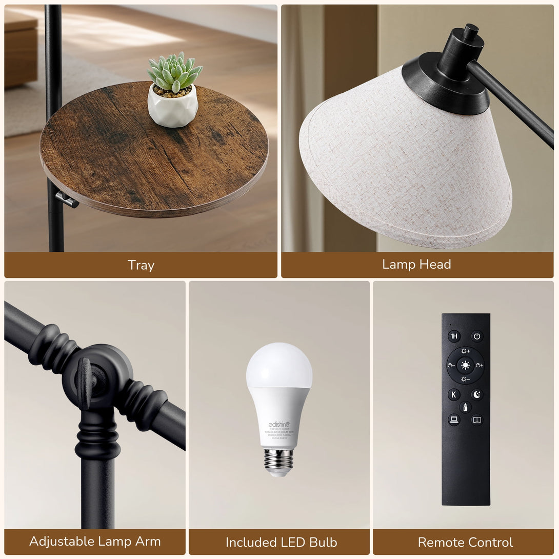 EDISHINE 68" Floor Lamp with Table for Living Room, Height Adjustable, 5CCT, Dimmable, Remote Contronl, Brown Wood Grain Tray, Black Standing Light with Linen Shade, LED Light Bulb In