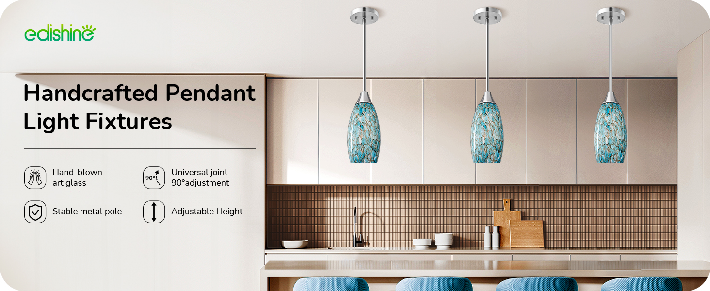 【Unique Art Outlook】Stained and polished art glass is handcrafted, each piece of glass has different color and pattern; with gorgeous color and thick glass this pendant light is exquisite and beautiful enough to be a major highlight of the kitchen remodeling, which creates a cozy and comfortable environment for your room