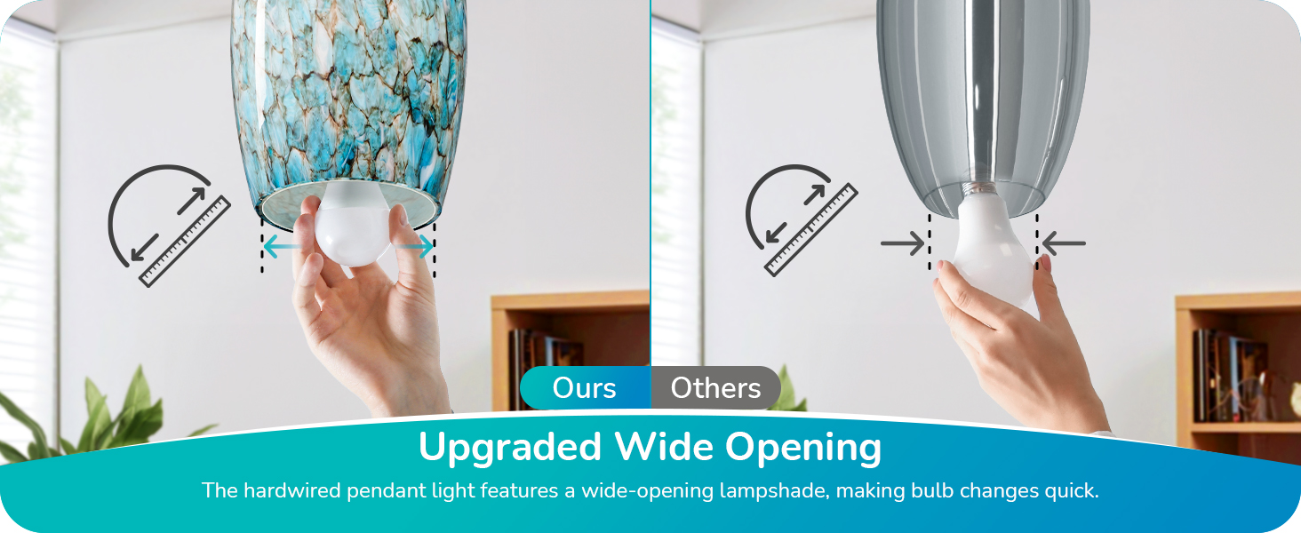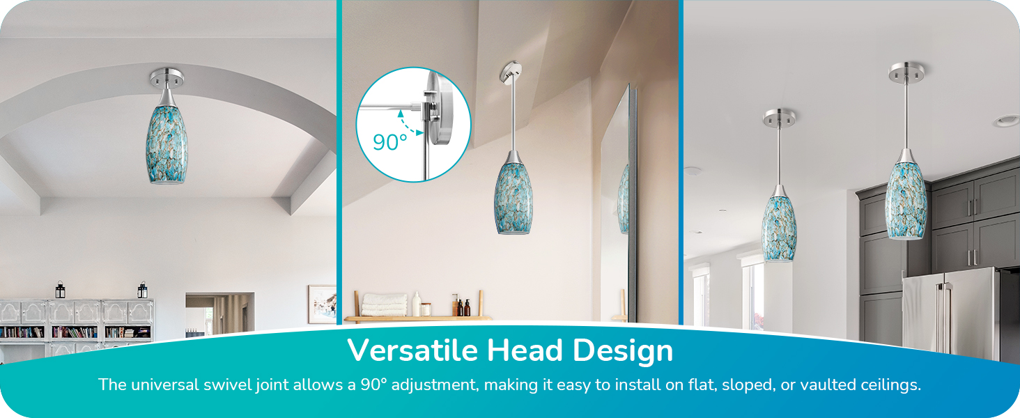 【Easy to Install】Comes with a convenient installation pack our pendant light fixture is easy to install, just connect the wires and mount the bracket; wider diameter of the shade opening makes easy to replace bulb; with universal head design, the glass pendant light can be 90° adjustable, and can be installed on a flat or sloping ceiling