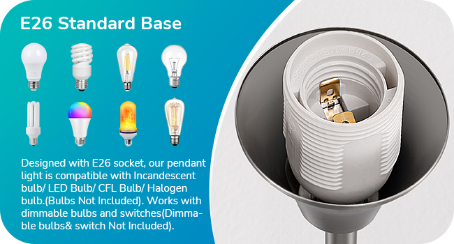【Compatible Bulb】Designed with standard medium E26 socket, this modern pendant light is compatible with Incandescent bulb(60W)/ LED Bulb(12W)/ CFL Bulb(13 W)/ Halogen bulb(43 W), bulb is not included; support to dim with compatible dimmer switch and bulbs (not included), can be purchased separately as needed