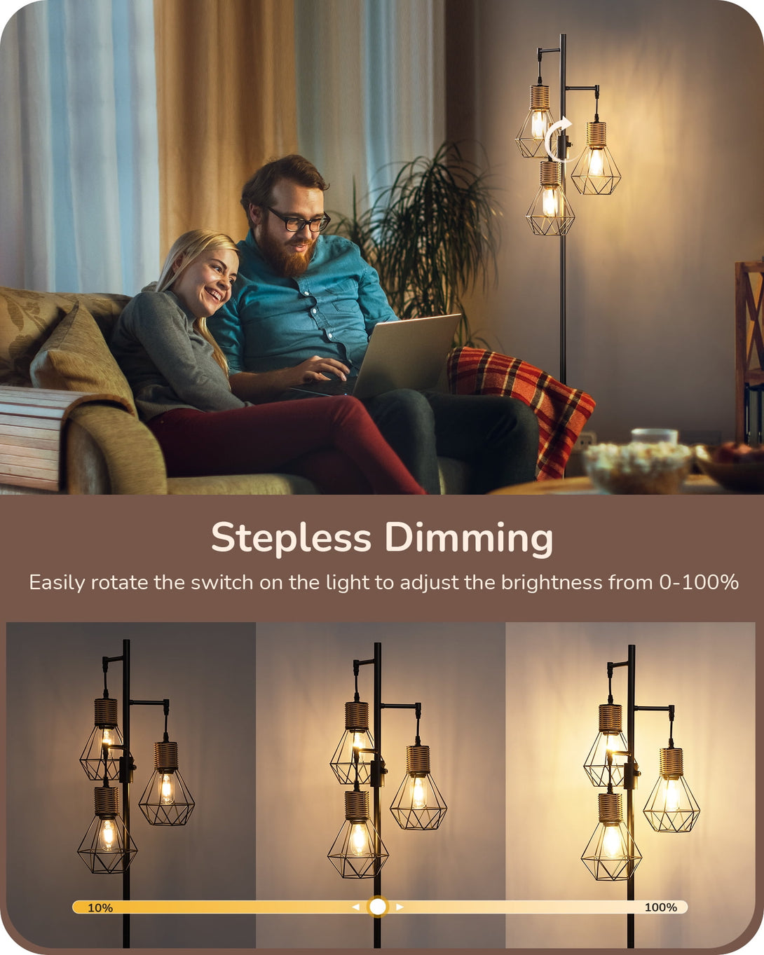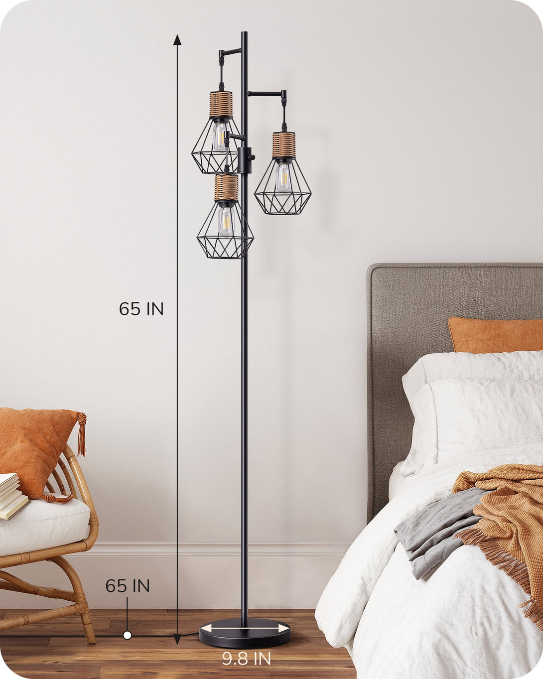 EDISHINE Industrial Rattan Floor Lamps for Living Room Clearance, Dimmable, Metal Three Head Floor Lamp for Bedroom, Office, Black, LED Bulbs Included
