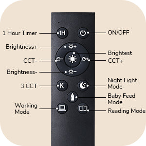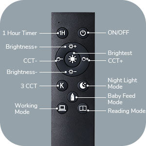 Various Modes: Reading mode, working mode, nightlight mode, baby feed mode, brightness and CCT adjustable, timer setting